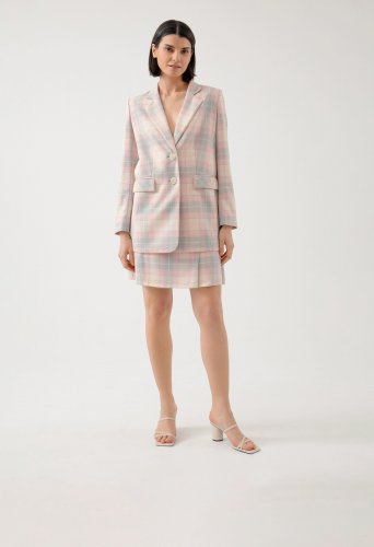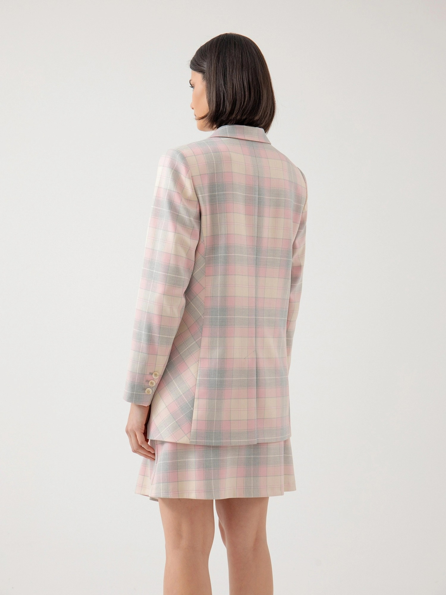 На сайте указаны российские размеры. Удлинённый прямой однобортный жакет с двумя пуговицами из костюмной ткани в серо-розовую клетку. Английский воротник с V-образным вырезом. Жакет с прорезными карманами и накладными клапанами. Жакет полностью на подкладке. Рост модели 175 см.
