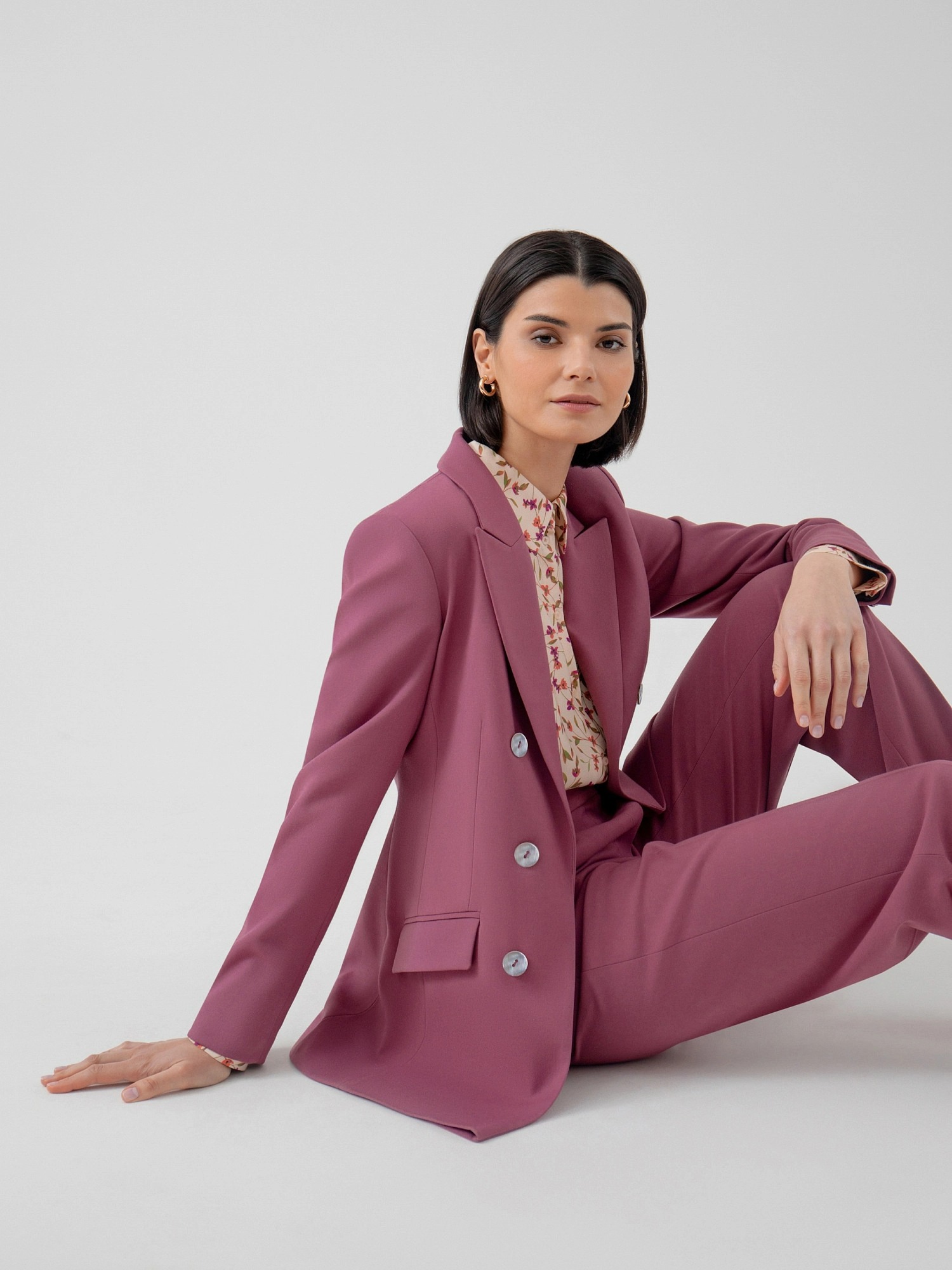 На сайте указаны российские размеры. Прямой удлинённый однобортный жакет с ложной застежкой на пуговицы. Английский воротник с остроконечными лацканами. На полочке два наклонённых кармана с клапанами. Жакет полностью на подкладке и выполнен из костюмной ткани в благородном цвете "амарант". Составит дерзкий ансамбль с широкими брюками из этой же ткани. Рост модели 175 см.