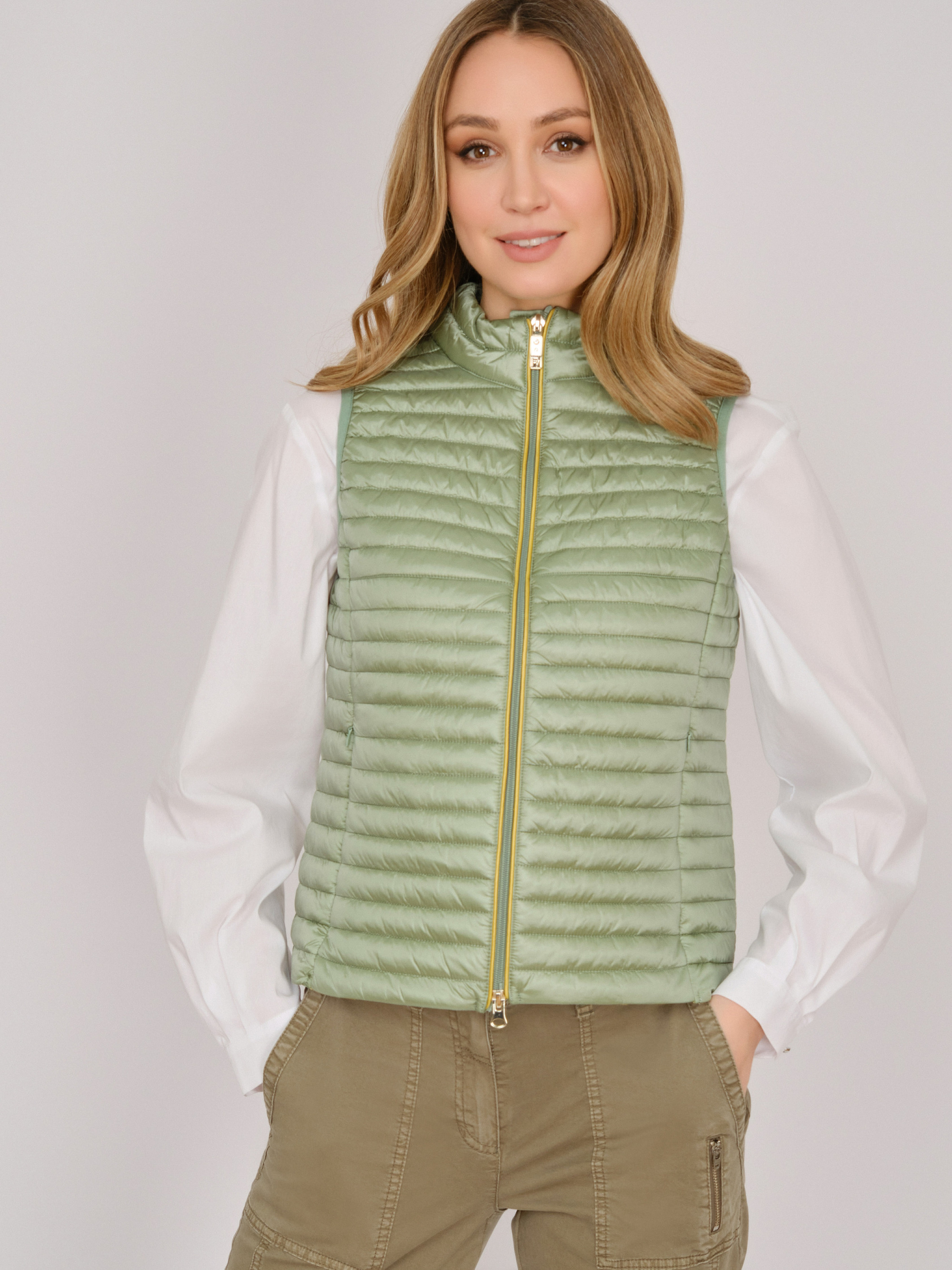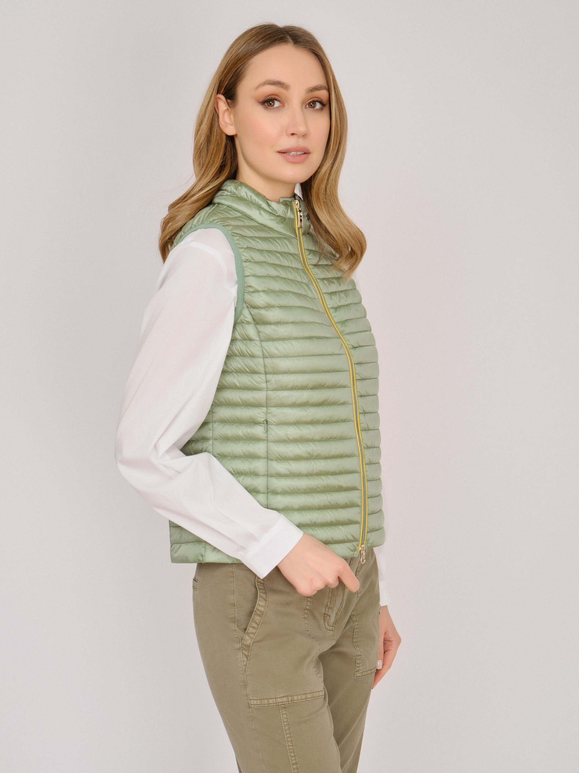 На сайте указаны российские размеры. Полуприталенный стеганный мятный-зеленый жилет на молнии, с карманами в шве на молнии. Длина по спинке: 54 см. Рост модели: 175 см.