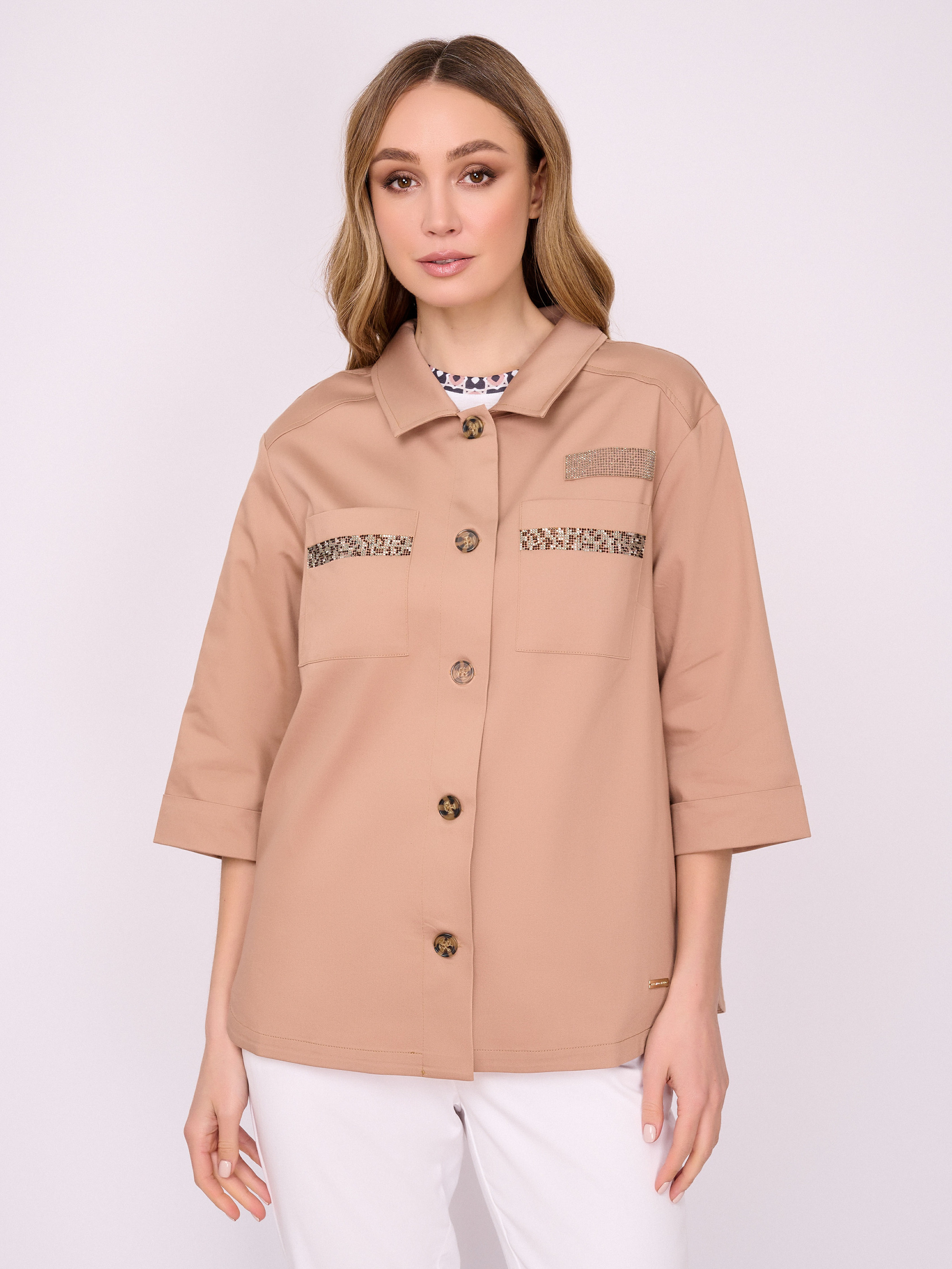 На сайте указаны российские размеры. Бежевый жакет трапеция на пуговицах, с отложным воротником, с накладными карманами, с рукавом 7/8, со стразами, с боковыми разрезами. Длина по спинке: 67 см. Рост модели: 175 см.