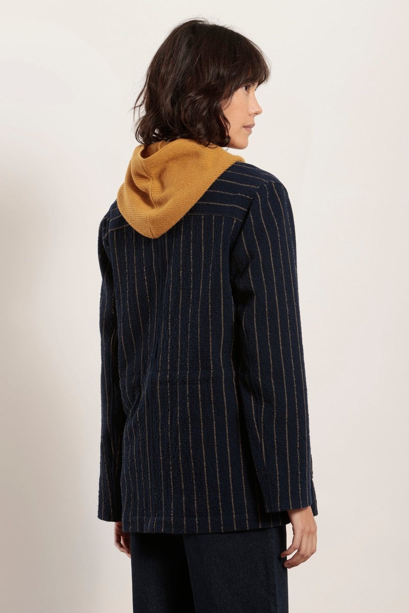 Полосатый пиджак из тонкополосной шерстяной ткани. Длинный, прямой крой. Длинные рукова. Застежка на пуговицы с роговым эффектом. 2 больших передних накладных кармана. Талия затянута шнурком в морском стиле. Тканевая подкладка. Внутренняя отделка спинки из контрастной ткани с узором в мелкую клетку.