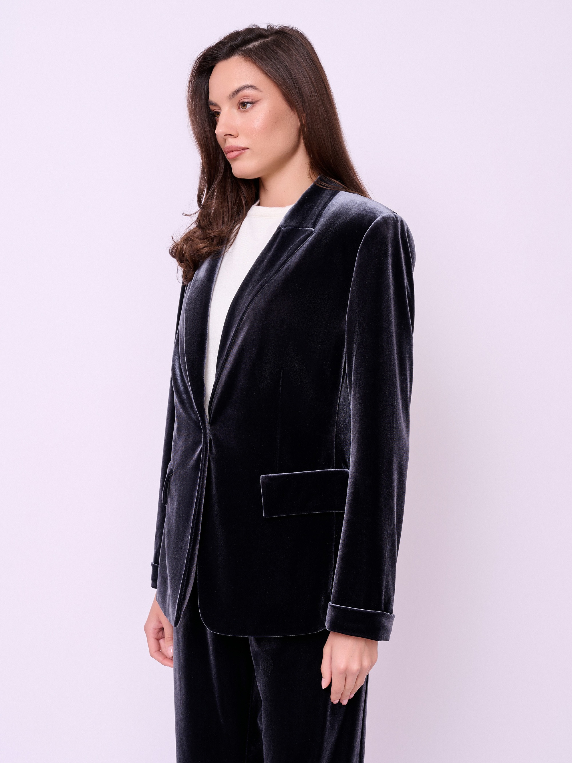 Однобортный жакет из трикотажного бархата полуприталенного покроя на пуговице с прорезными карманами и клапанами. Длина по спинке: 65 см.
