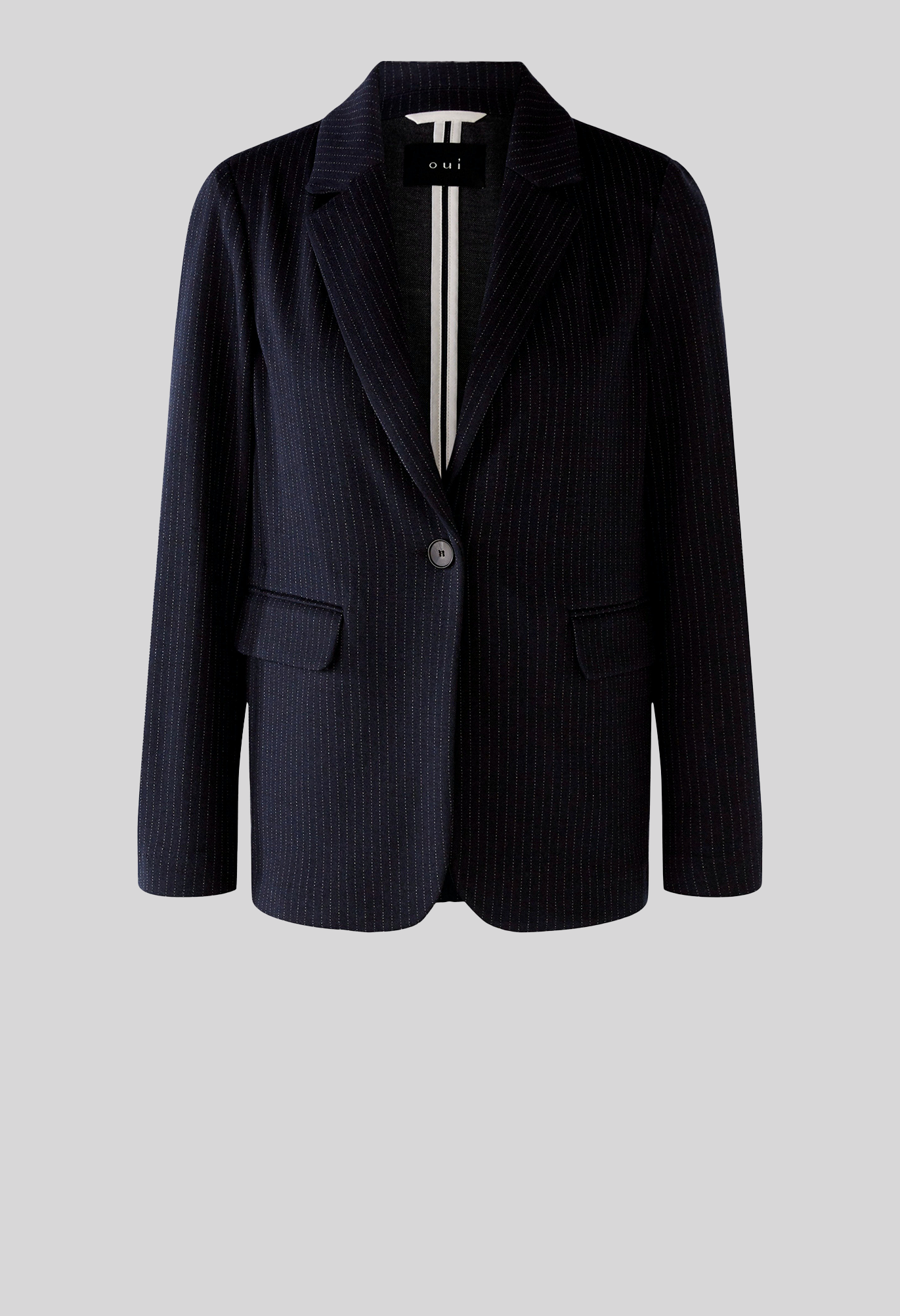 Блейзер из плотного трикотажа. Прямой крой, стандартная длина. Однобортный с воротником с лацканами. Без подкладки. С карманом на клапане и подплечниками. Длина для размера 42 - 69 см.