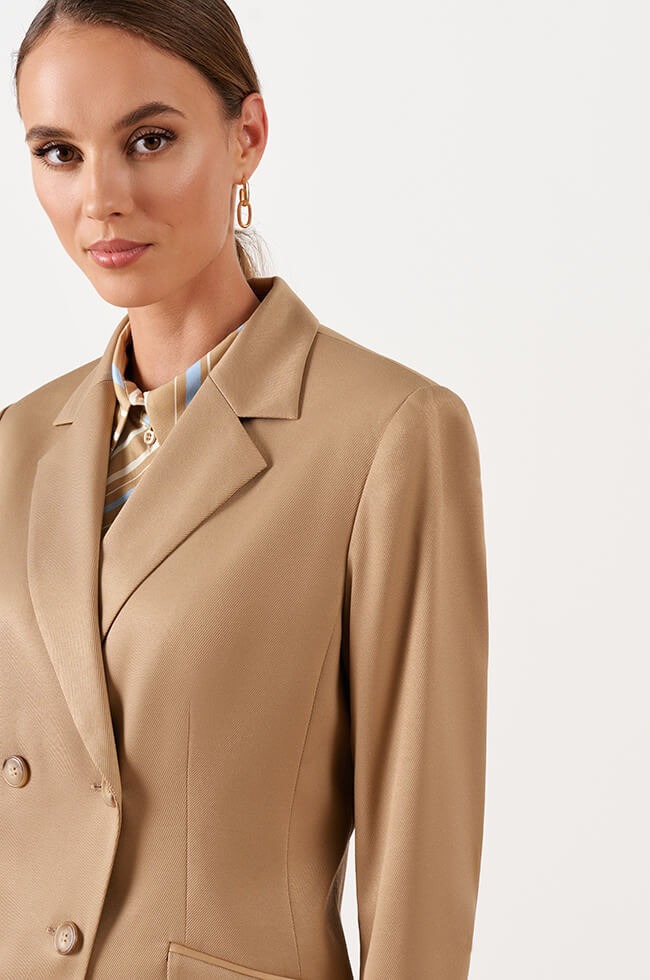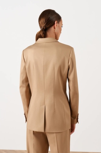 Стильный двубортный жакет прямого силуэта. Отложной воротник с лацканами. Застежка на три роговые пуговицы. Рукава заканчиваются шлицей с имитацией застежки на роговые пуговицы. Спереди имитация карманов с клапанами. Средний шов спинки заканчивается шлицей. Подкладка с дизайнерским принтом «Гортензия».