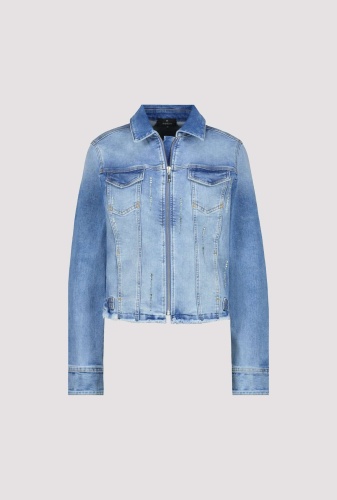 Стильная джинсовая куртка с мерцающими полосками из стразов. Закругленный подол с бахромой подчеркнут закрепкой. Регулярная посадка. Длинный рукав. Подол рукава с разрезом и манжетами. Накладные карманы с клапанами на уровне груди. Длина 44 размера 55 см.