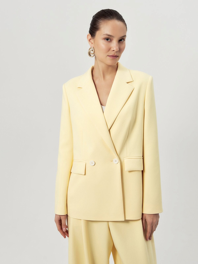 Удлиненный двубортный жакет прямого силуэта в нежно-желтом цвете из хлопковой костюмной ткани. Рукав полной длины с одной пуговицей на шлице. Прорезной карман с клапаном. Жакет на подкладке.