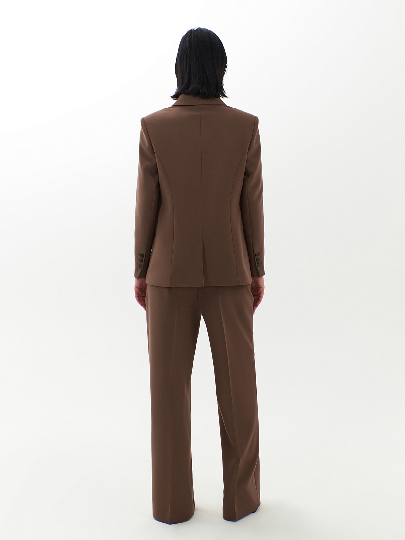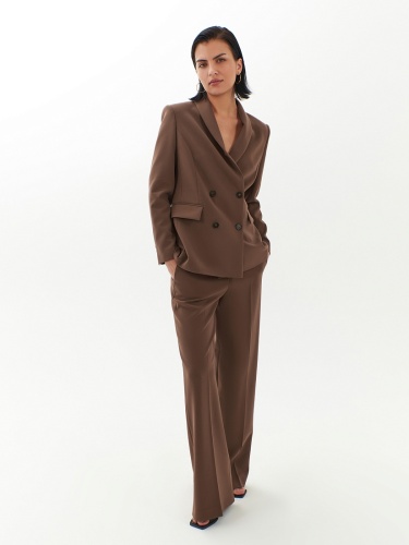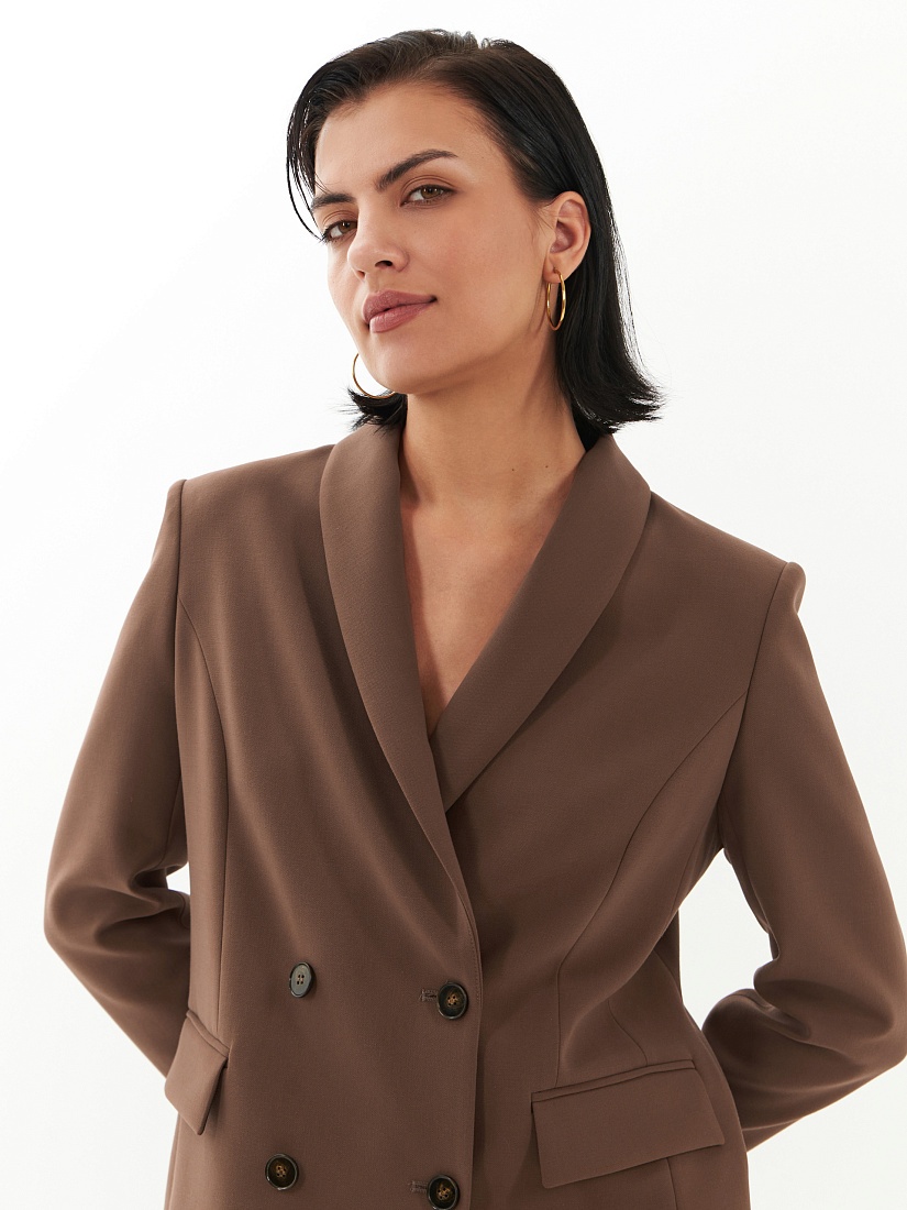 Классический двубортный полуприлегающий жакет с V-образным вырезом горловины, воротником-шаль. Выполнен из костюмной ткани в благородном цвете "каштан". На жакете прорезные карманы в рамку. Жакет на подкладке.