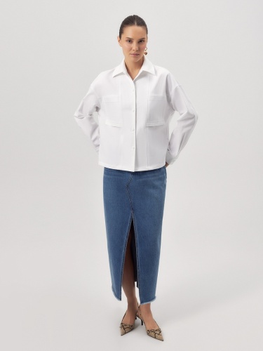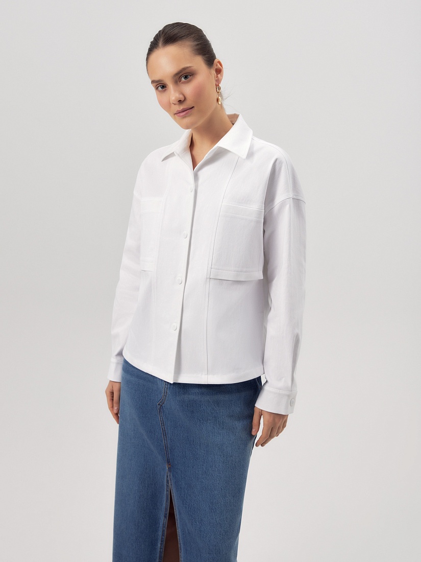Жакет прямого силуэта с классическим отложным воротником, спущенным плечом и рукавом полной длины на манжете. Застежка спереди на кнопки в цвет ткани. Спереди рельефы и накладные карманы. Идеальный вариант для прохладной погоды. А белый цвет идеально сочетается с большим количеством повседневной одежды разных стилей.