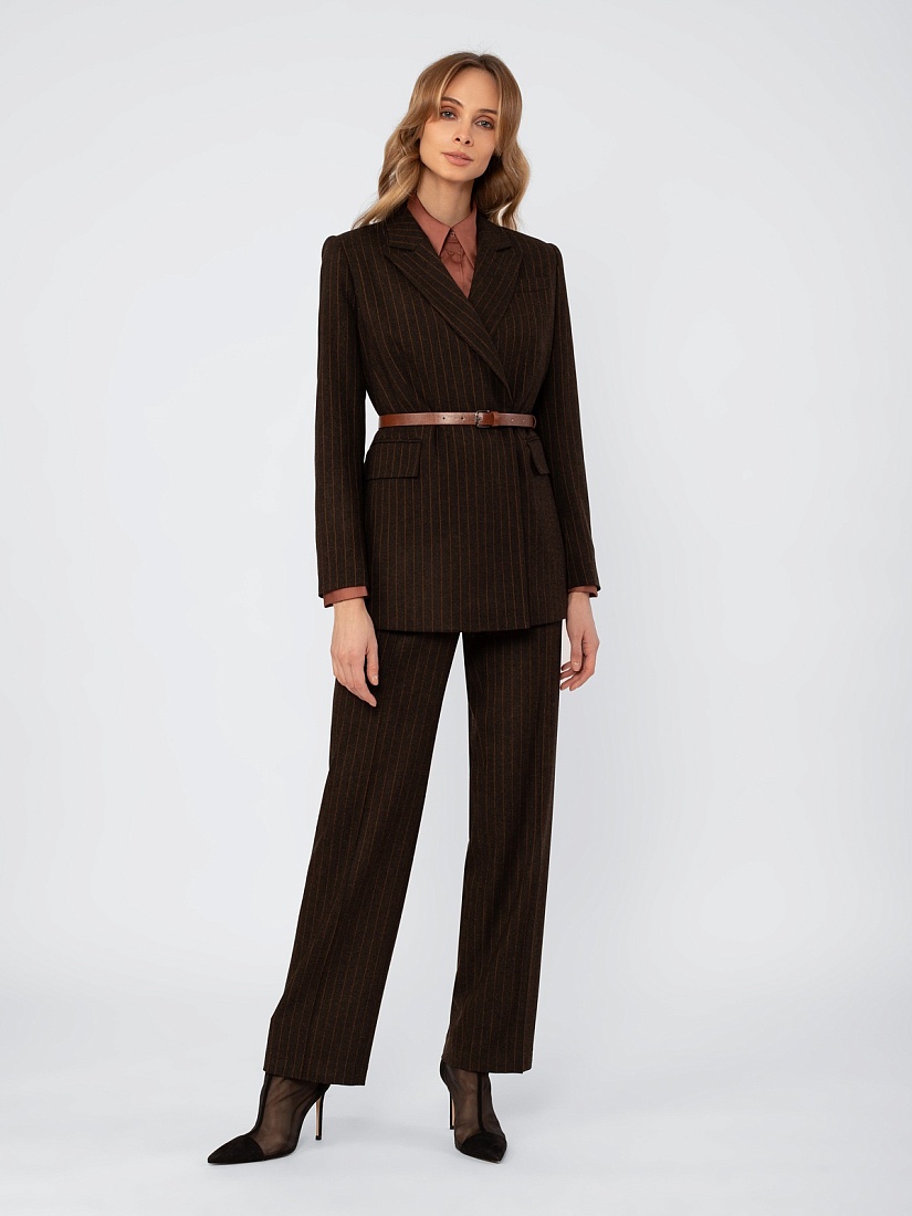 Жакет в стиле кэжуал, полуприлегающего силуэта, на подкладке. Застежка на пуговицы. Воротник английский. Рукав втачной. Карманы с клапаном. Ремень из экокожи с пряжкой.