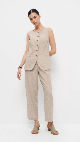 Жилет изготовлен из высококачественной ткани, сочетающей в себе премиальный лён и тенсел с эффектом меланжевой нити. Это обеспечивает изделию не только роскошный внешний вид, но и долговечность, а также комфорт при носке. Изысканный оттенок «солёная карамель» добавит изысканности и шарма в ваш образ.